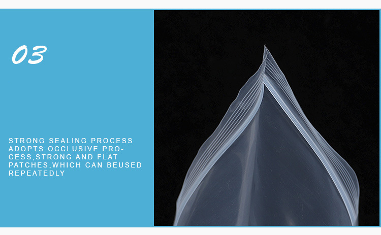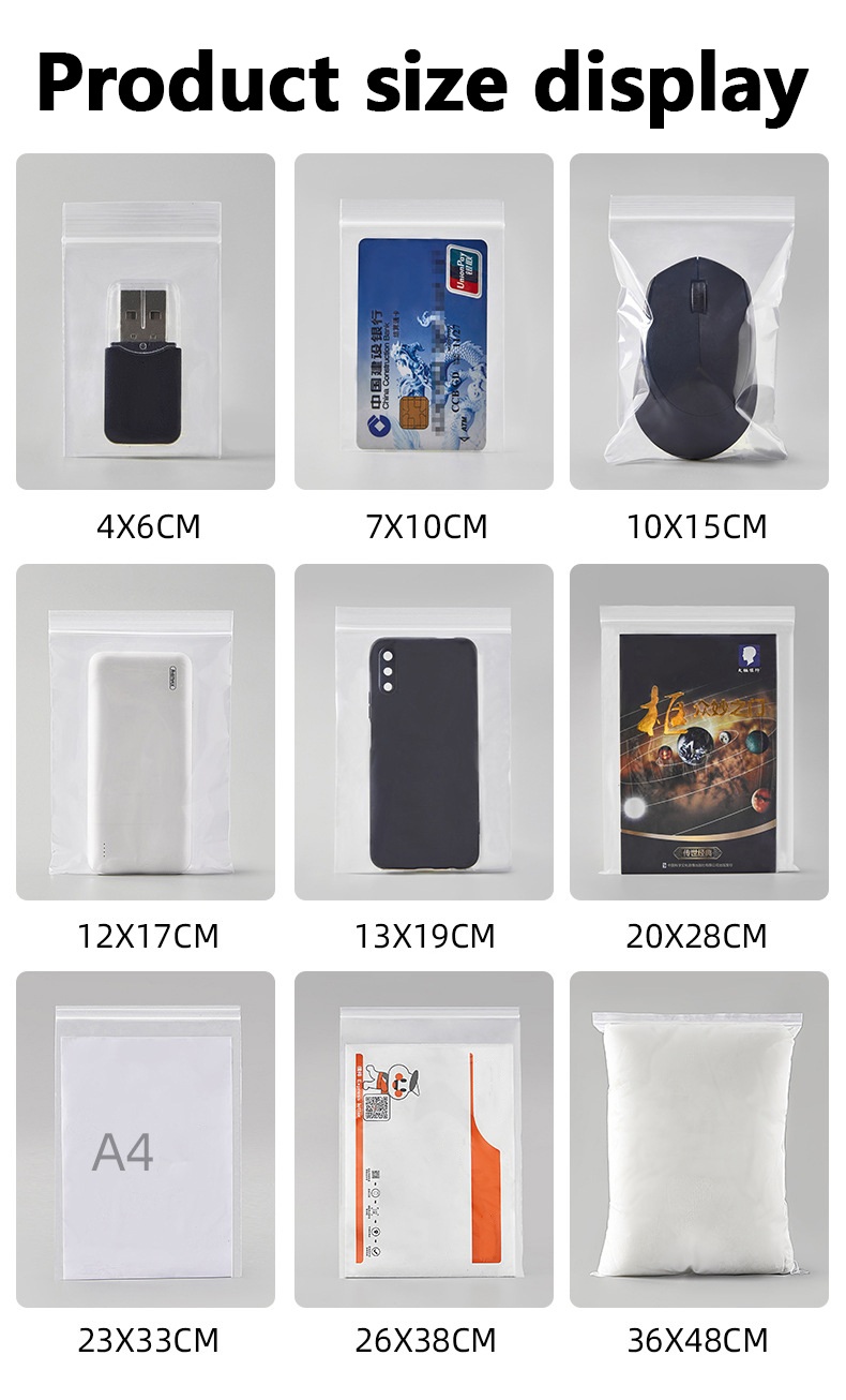 Iarratas: Málaí Ziplock In-athshéalaithe tá méideanna éagsúla oiriúnach do réimsí éagsúla, mar shampla stóráil, éadaí, bróga, jewelry, leighis, gabhálais crua-earraí, etc.